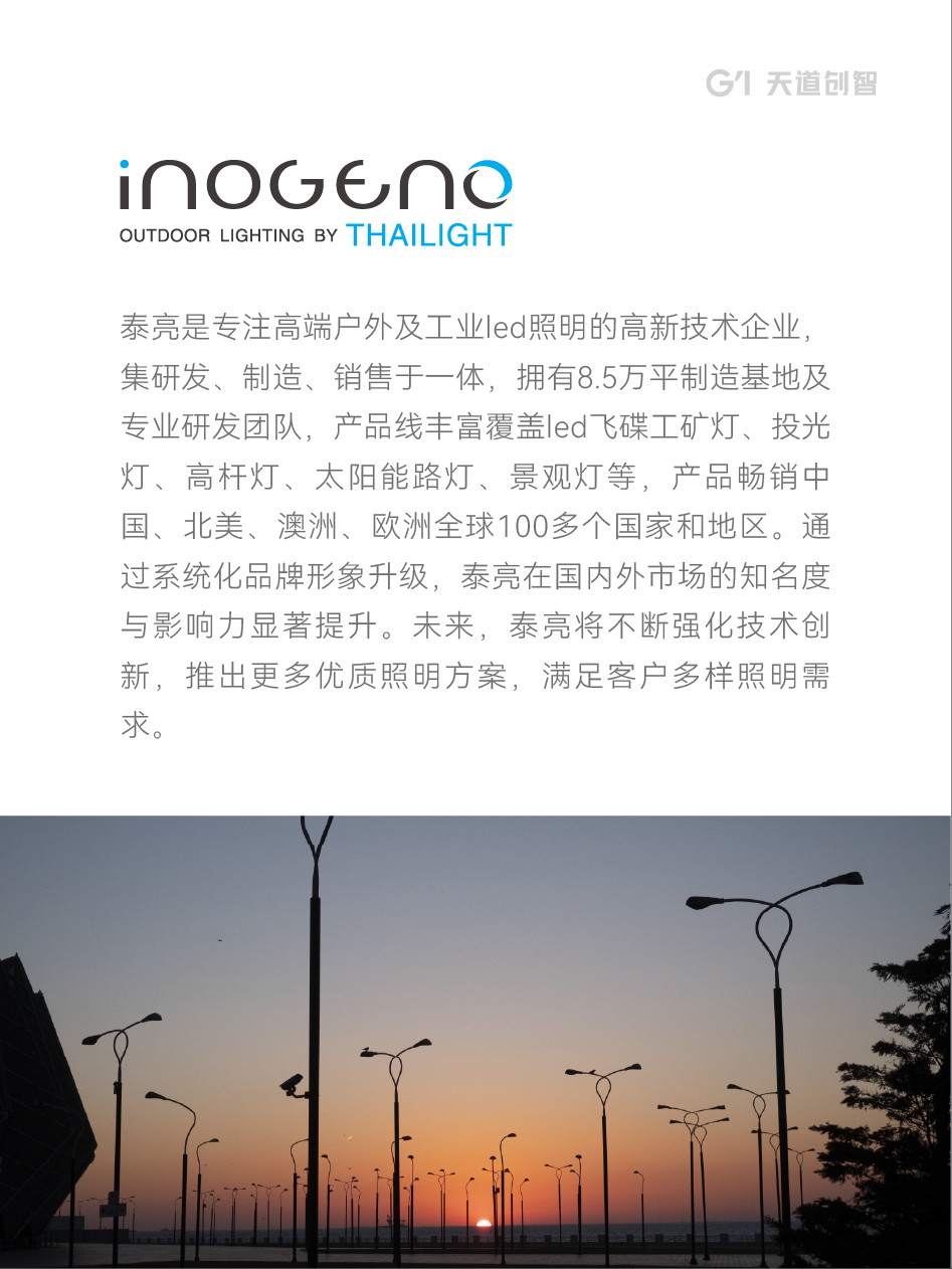 泰亮是专注高端户外及工业 led 照明的高新技术企业,集研发、制造、销售于一体,拥有8.5万平制造基地及专业研发团队,产品线丰富覆盖 led 飞碟工矿灯、投光灯、高杆灯、太阳能路灯、景观灯等,产品畅销中国、北美、澳洲、欧洲全球 100 多个国家和地区。
